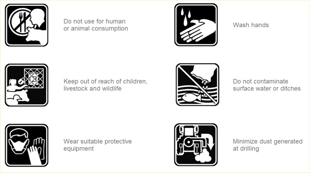Do not use treated seed for human or animal consumption or for processing. Keep out of reach of children, livestock and wildlife. Handle seed packages carefully. Avoid contact with skin and respiratory tract and wear suitable protective equipment during seed handling and equipment cleaning. Wash hands and exposed skin before meals and after work. Remove any seed spillages. Keep treated seed away from surface water.